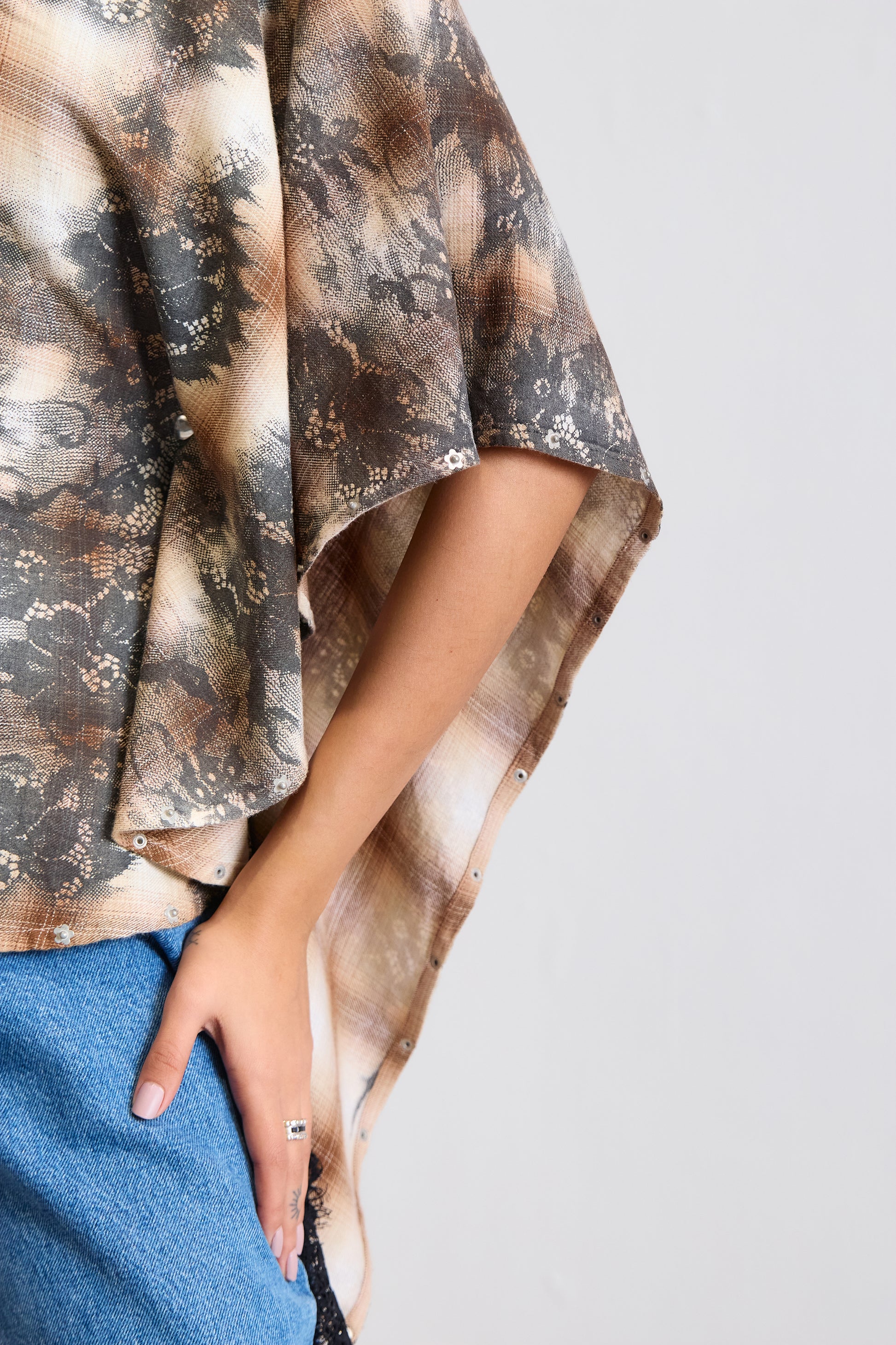 This contrasting print on check fabric and the comfy versatile silhouette which can be worn two ways - off the shoulder or V - neck also had floral metal detailing through out the border.